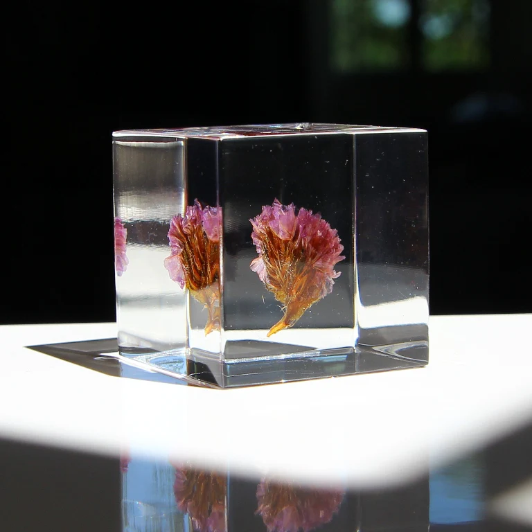 Die Pflanzen stammen aus der Natur und variieren daher in Größe, Farbe und Form. Jeder Würfel wird sorgfältig von Hand gefertigt, während des Produktionsprozesses können jedoch sehr feine Luftblasen oder pulverähnliche Materialien der Pflanze innerhalb des Würfels auftreten.